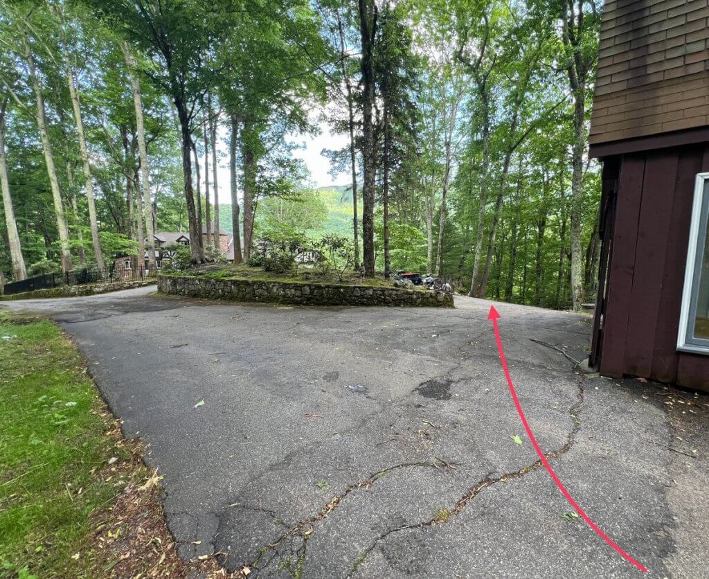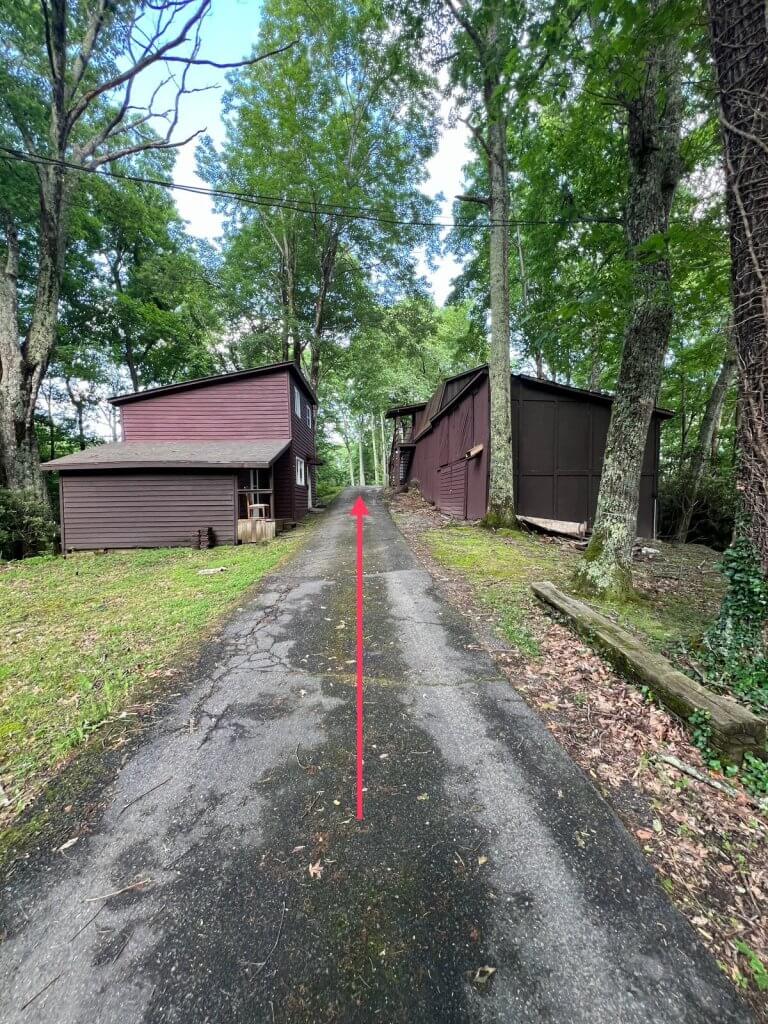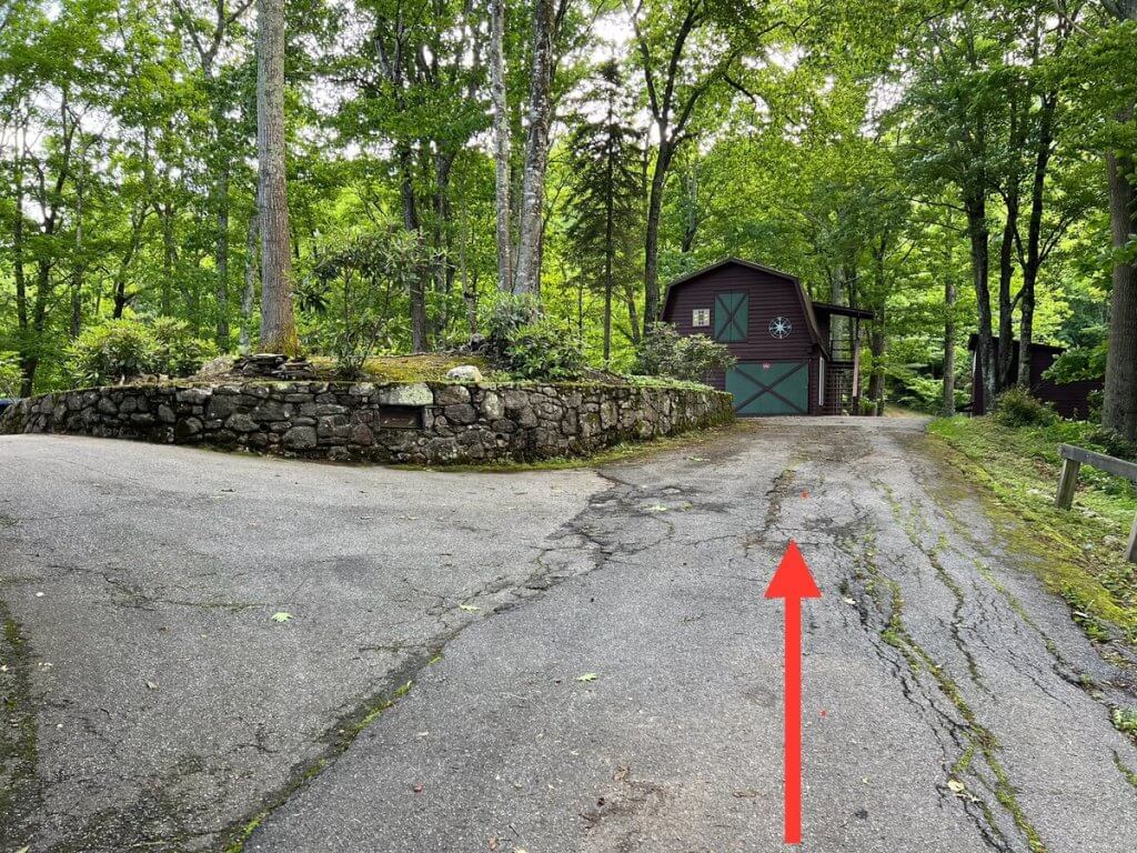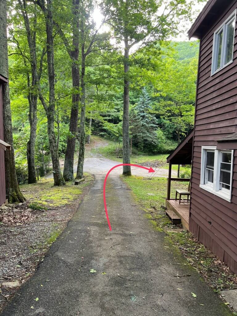 After you drive around the house, you’ll come to a stone wall with a drive way on the left. Continue straight when you arrive at the stone wall.