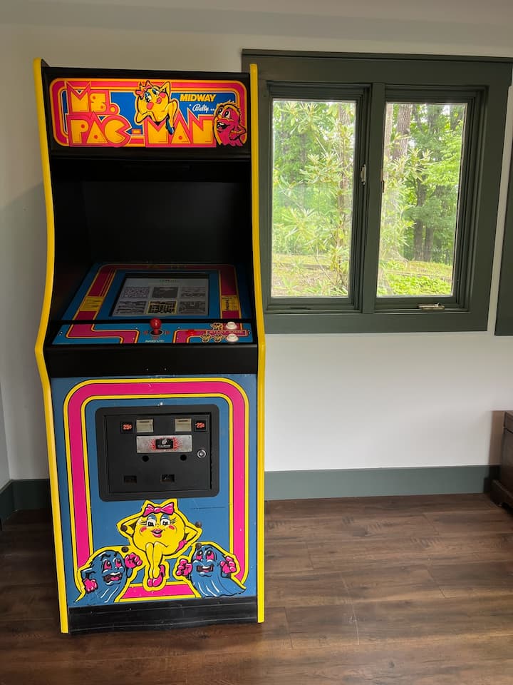⛫ Gameroom with Multi-Game arcade featuring more than sixty classic arcade games, skeeball, shuffleboard and HUGE TV.
