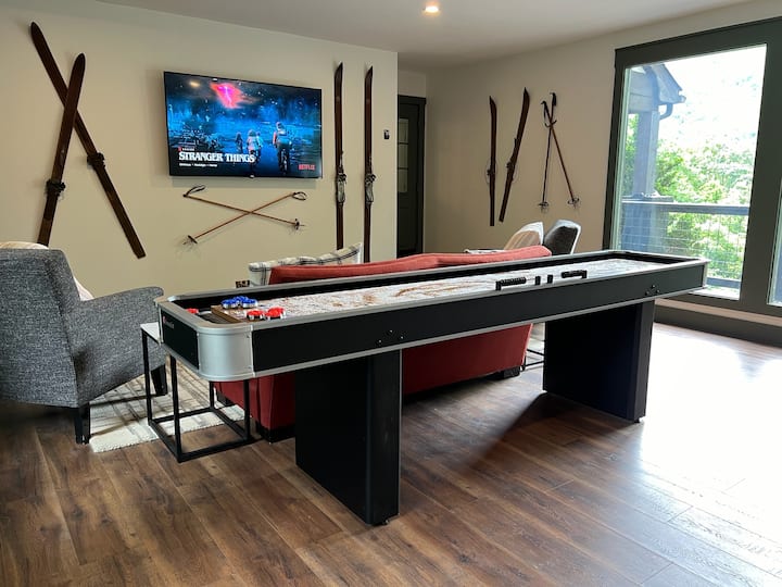 On the main level, guests will enjoy a luxurious primary suite with an enormous wet room, complete with dual showers and a soaking tub. In addition to the primary suite on the main level, guests will find another bedroom with a queen bed. The main level also hosts a large living room with stone fireplace with neighboring grand windows that frame in the classic Grandfather Mountain profile. Guests will also find a game room on the main level as well, complete with a classic multi-game arcade, skeeball and shuffleboard.